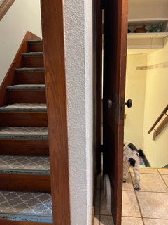 Stairways across from Family collage wall (kitchen to the right and den to the left):