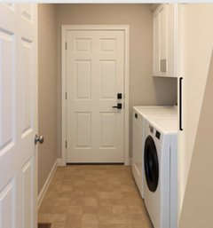 A homeowner adds cabinets, shelves and a hanging rod to make her basic laundry room more functional and beautiful