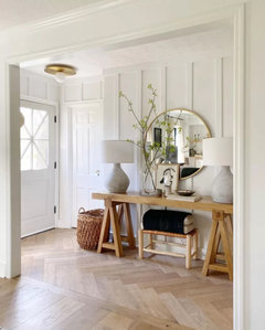Raw materials and a sense of calm make these farmhouse- and cottage-style foyers both practical and inviting