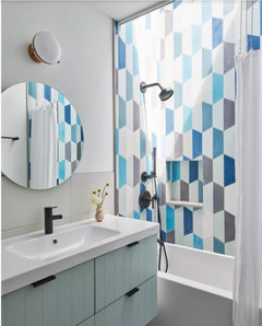 See how designers enhance the classic space-saving feature with tile color, vanity style and other design details
