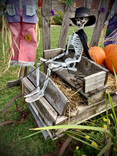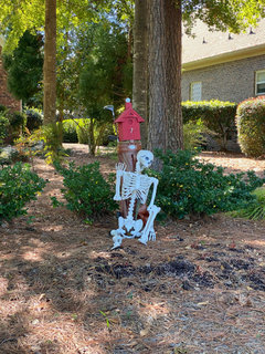 DH and DS are both on our neighborhood village association board. It isn't an HOA - just community and hosts a fall festival and a pool party each year. They do Halloween and Christmas decorating judging and last night they voted on the Halloween one. We have a small handful of folks who go through great effort and expense to put up a lot of decorations - and they all have a lot of skeletons and other grim creatures. They are the one ones they get considered. One house has a group of 8-12 skeletons they reposition each day. On the day the photo was taken they had a couple having a drink at a table and another group in a cheer tower pose - more humor than gore. DH voted for them, but they got honorable mention.