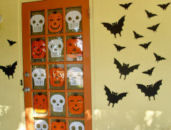 I can’t take credit for idea, I saw it years ago on the Williams Sonoma site, although we added the lights and sounds (and vampire face instead of just a smiley one).Inside, my decor is more vintage and Folk Art Halloween decor.
