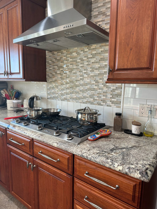 Since the appliances are stainless steel, you might consider adding a hood cover in copper or stainless steel—it could help make the overall color scheme look more consistent.