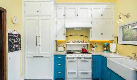 COLORFUL KITCHENSYellow-and-Blue Kitchen Mixes Modern Amenities With Vintage Charm