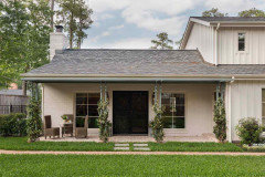 Farm-fresh colors, classic dark hardware and a wraparound porch contribute to this traditional look