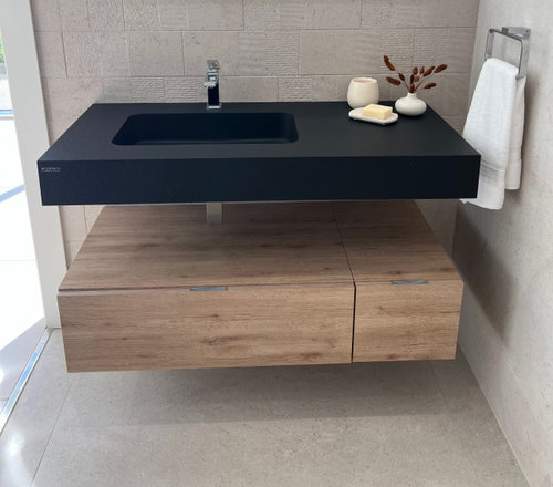 Determination, DIY skill and a stunning tile feature wall helped make this formerly dark and gloomy powder room feel spacious