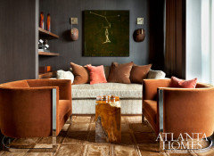 A modern blue, gray and orange rug is at the center of a redesign that embraces the homeowners’ art collection
