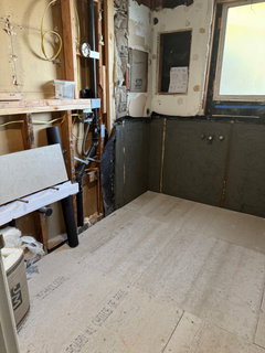 This now-airy Whidbey Island bathroom features a soaking tub, a walk-in shower, heated floors and an expanded water view
