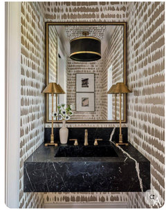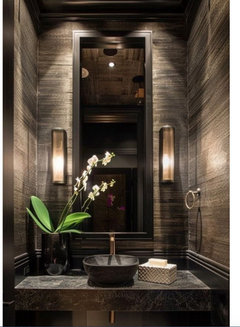 Bold wallcoverings, dark accent walls, vessel sinks and warm metals elevate these small bathrooms