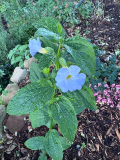 This is a thunbergia I got from Annie's a few years ago. Really slow to start. But such a pretty, pale blue flower.