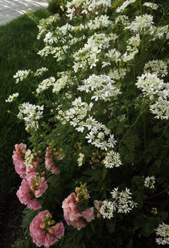 Deborah, I've been wanting to comment on your plonk, and now I'm farther behind than ever. See my plonk comment on Mose's post. But your plonk is stunning and elegant looking with the background of leaves and buds with blooms in front. You took a hunk off that rose. Why do you and everyone else think it's necessary to prune so hard every year? I am truly curious. I don't prune all my roses, and my pruning varies from pretty hard to a light trim. Some roses do really need a good prune every spring, though. Your thumbergia is so lovely, looking a bit like Heavenly Blue morning glory. You know gophers and all mammals hate morning glory, too. It's toxic to them. Your snap is a pretty color, but I've never grown that series, so I don't know if it's Potomac. That vase is wonderful and definitely a cracker upper.......That might be orlaya in the corner of the pic. I'll post some pics of my orlaya and maybe that will help you decide what it is. Diane