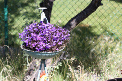 Trish, I granted your wish for rain and sent ours. And now it's too much rain for you. And you have a swimming suit! That fits! I think the suit that's in my dresser dates to 1989--seriously, and I should try it on or try to it on for laughs. Thank you about the pinks. They and the purples above are from 2025. I think Ive pretty well mined the oldie stuff......Maybe your yellow iris weren't the old standby, bearded iris. There are several types that really like wet environments that are, perhaps, tougher......My Wind in the Willows is the Michael Hague illustrated book. I am a huge fan of his, and have a lot of Hague's work. Not sure if he is still alive...... The lizard is displaying protective coloration against that bright background, but keep trying and you'll see him. He's quite bumpy, too......I laughed aloud at the Louis XlV reference. I know exactly which famous portrait you're referring to--the one with old Louis in high heels, tights to show off his manly legs and posed balletic-ly, mountains of lace all over him, and that gigantic wig looking like the whipped topping on a cake: l'etat c'est moi! Love your little plonk. You use lots of Tallulah, which must mean she blooms often, a good thing. Is Forget-Me-Not the darker pink?