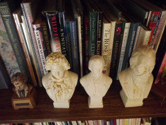 Diane - I'm not good enough at recognizing composers to know who those geezers are. Although the first 2 busts look like Beethoven?? Your Evelyn does look a lot like the rose in the dish. I adore the 2nd picture of Evelyn!!! That color and those petals!!! SWOOOOON!!!!! Awww, yes, I see the little bunny. That's sooo sweet. :) :) The Orange Dude isn't gigantic in your yard. So it fits better with your small, leftover spaces. What a rose!!