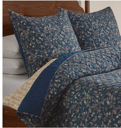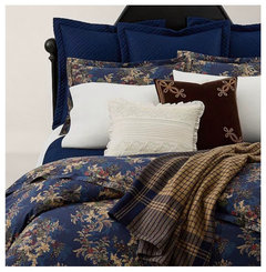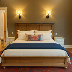 Dark paint and antiques mix with newer pieces and light bedding for a sleeping space that appeals to him and her