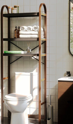 A designer uses a light palette and hardworking cabinetry to update a couple’s 1970s hallway bathroom