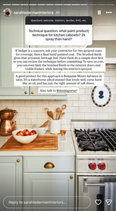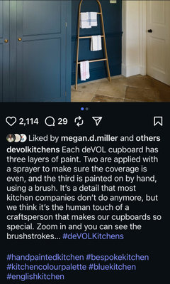 Original Authorlast month@John Liu Exactly. It would be very subtle hand brushstrokes so more artisanal versus a perfect 'factory finish'. In addition, if it ever needed to be repainted it could. That's the idea of Plain English kitchens - they are intended to last in perpetuity and can be touched up if needed.