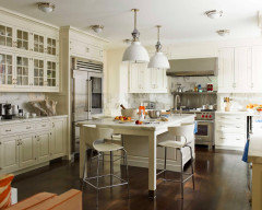 BUT... None of these pics show them in combo with pendents. In fact, none of the kitchens I have used flushmounts in have had pendents. I think you need to be careful to not go on decorative lighting over kill. As much as I like surface mounts rather than recessed lights -- I like the old time feel of them, using recessed lighting will let your pendents and sconces be the starts of the show. It is all about balance.I'd purchase some balloons and inflate them to various sizes that measure the size of the lights you are looking at. Then tape them up on your ceiling in a pattern more or less like what you are anticipating. It doesn't even matter if it is in your kitchen or elsewhere in your house that has a similar ceiling height. It will give you more of a realistic feel for the scale and size and look of having many flush mounts in a space.