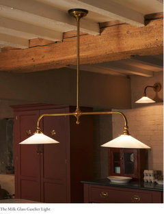 I had also considered this direction, as I also like the idea of avoiding your standard pendant-over-island combo, but dismissed it thinking we could benefit from 3 lights over our 10'-ish island:deVolMilk Glass Gaselier Light