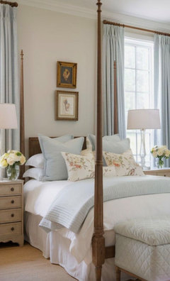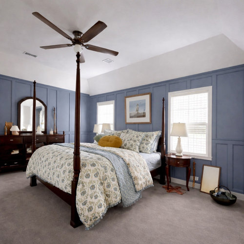 Blue-and-white walls and accessories complement existing furnishings and a ceramics collection in an Atlanta guest room