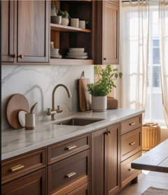 A designer transforms a dated white kitchen with warm wood, bold stone, smart storage and a glamorous new bar area