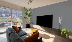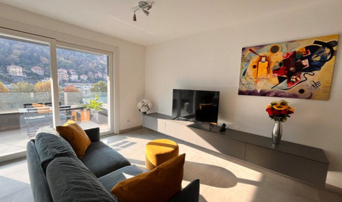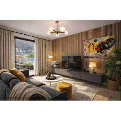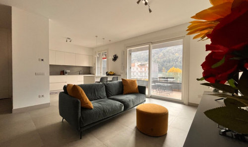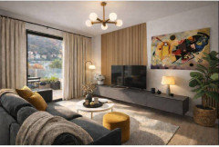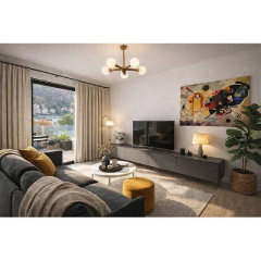 A reconfigured entry, expansive windows and modern furnishings create an inviting living room with stunning vistas