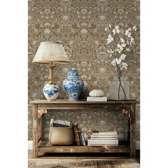 A special wallpaper print and curated antiques help update this powder room in a 1790 Boston home