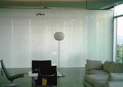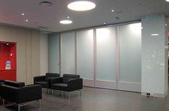 Ethereal photographic images seem embedded in these wall-size glass panels