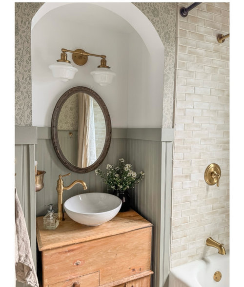 Graphic wallpaper, ornate chandeliers and furniture-like pieces help these bathrooms seem less like a sterile space and a lot more like home