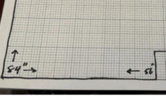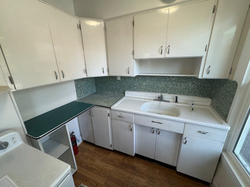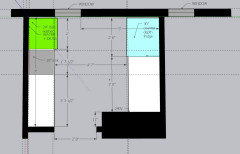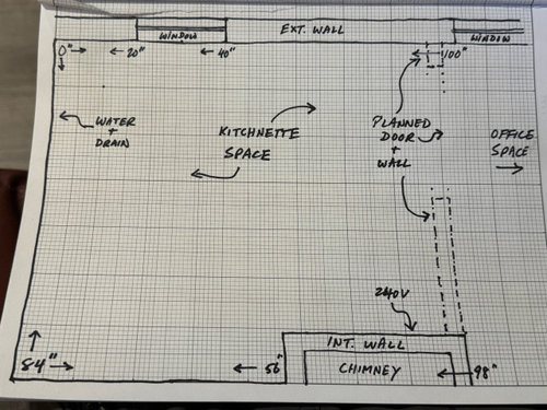 The kitchenette space will be a bit less than 100” x 84”, with an 11” deep bump-in where the chimney lives, and one window. This will be clearer when you see the photos.