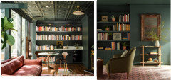 An open-plan space is divvied up into a dining room, foyer and library–music room in a family-friendly way