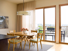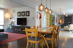 --Be on the lookout for a dining table with an MCM vibe--check Facebook Marketplace, Craigslist, thriftshop. Simple lines. Then look at West Elm dining chairs and see if you can find more affordable versions on Wayfair. Ditto more modern pendant over the table.