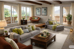 Off the top of my head, I suggest removing all the "faux"stuff: ceiling beams and flooring. Upgrade to real wood flooring, at least around the sunken living where you could get away with some light, nubby real wool carpeting. Real wood floors will make that fireplace and some of your wood pieces look better instantly. Plan to replace the French provincial farmhouse dining set with a thrifted more modern table and dining chairs. They don't have to match! Check out Chairish and 1st Dibs then offer half or two-thirds the price.