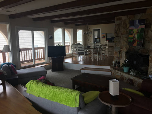 Luckily you don't have to do anything to the windows and door wall to raise the floor. And the beams are faux, easy to remove. When you post more pics from every side looking back into the space, include after dark shoots.from each side with lighting. New lighting design with smaller recessed LEDs can be used. Which direction is South and what climate is your location in.