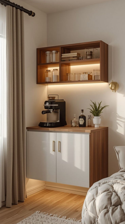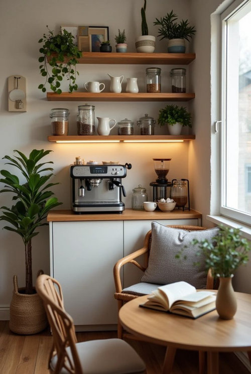 I think Sigrid has made a very good point. All you really need for a coffee corner is a coffeemaker, a place to put it, and a way to power it, plus a place to store your coffee beans (or ground coffee) and some cups. You could even manage with a kettle (electric or stovetop) and a pourover coffee maker, such as a Melitta.