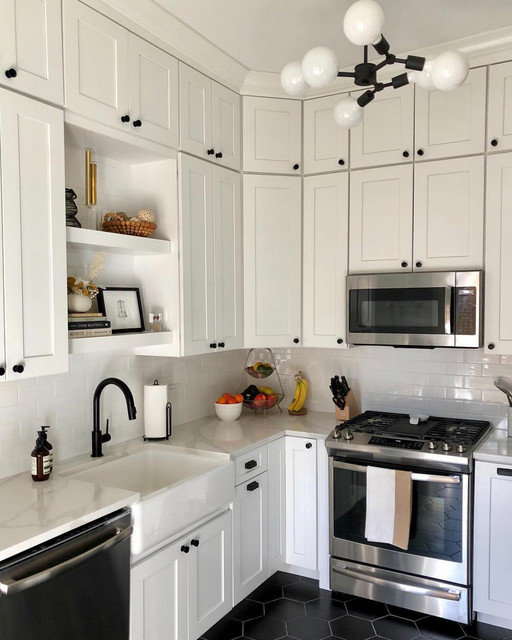 Example of a mid-sized farmhouse u-shaped porcelain floor and black floor enclosed kitchen design in Chicago with a farmhouse sink, shaker cabinets, white cabinets, quartz countertops, white backsplash, ceramic backsplash, stainless steel appliances, no island and white countertops — Houzz
