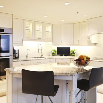 Finishing Touches: Counters around the kitchen and the island are covered with a Cambria quartz that has the light, airy look the homeowners wanted and resists stains and scratches. A geometric marble tile backsplash is an eye-catching decorative element.
