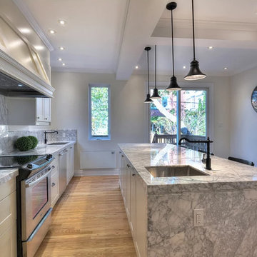 Example of a transitional u-shaped dark wood floor kitchen design in San Francisco with shaker cabinets, white cabinets, white backsplash, stainless steel appliances, marble countertops and porcelain backsplash