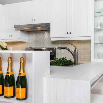 Inspiration for a large timeless l-shaped beige floor enclosed kitchen remodel in DC Metro with an undermount sink, recessed-panel cabinets, white cabinets, gray backsplash, an island and white countertops