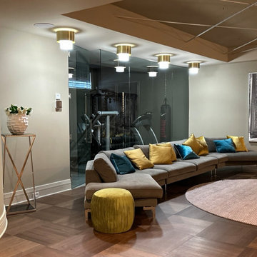 Urban look-out medium tone wood floor and brown floor basement photo in Atlanta with brown walls and no fireplace