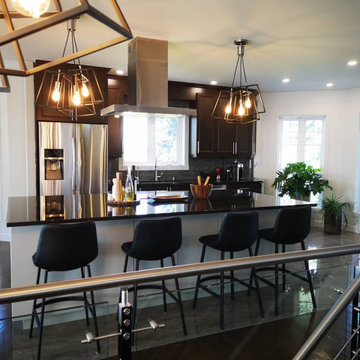 Eat-in kitchen - mid-sized transitional l-shaped medium tone wood floor and brown floor eat-in kitchen idea in Minneapolis with an undermount sink, shaker cabinets, quartz countertops, an island, dark wood cabinets, white backsplash, subway tile backsplash, stainless steel appliances and white countertops