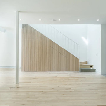 Example of a large trendy open concept light wood floor and beige floor family room design in New York with white walls, a standard fireplace and a stone fireplace