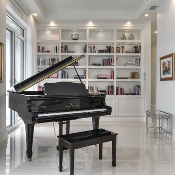 Boasting views of the Museum of Natural History and Central Park, the Beaux Arts and French Renaissance style building built in 1900 was once home to a luxury hotel. Over the years multiple hotel rooms were combined into the larger apartment residences that exist today. The resulting units, while large in size, lacked the continuity of a single formed space. StudioLAB was presented with the challenge of re-designing the space to fit a modern family’s lifestyle today with the flexibility to adjust as they evolve into their tomorrow. Thus, the existing configuration was completely abandoned with new programmatic elements being relocated in each and every corner of the space. For clients that are big wine connoisseurs, the focal point of entry and circulation lies in a 400 bottle, custom built, blackened steel and glass, temperature controlled wine cabinet. The once enclosed living room was demolished to create one main entertaining space that includes a new dining area and open kitchen. Hafele bi-folding pocket door slides were used in the Living room wall unit to conceal the television, bar and display shelves when not in use. Posing as kitchen cabinetry, a hidden integrated door opens to reveal a guest bedroom with an en suite bathroom. Down the hallway of wide plank ebony stained walnut flooring, a compact powder room was built to house an original Paul Villinski installation of small butterflies cut from recycled aluminum cans, entitled Mistral. Continuing down the hall, and through one of the walnut veneered doors, is the shared kids bedroom where a custom-built bunk bed with integrated storage steps and desk was designed to allow for play space and a reading corner. The kids bathroom across the hall is decorated with custom Lego inspired hand cast concrete tiles and integrated pull-out footstools residing underneath the floating vanity. The master suite features a bio-ethanol fireplace wrapped in blackened steel and integrated into the Tabu veneered built-in. The spacious walk-in closet serves several purposes, which include housing the apartment’s new central HVAC system as well as a sleeping spot for the family’s dog. An integrated URC control system paired with Lutron Radio RA lighting keypads were installed to control the AV, HVAC, lighting and solar shades all by the use of smartphones.