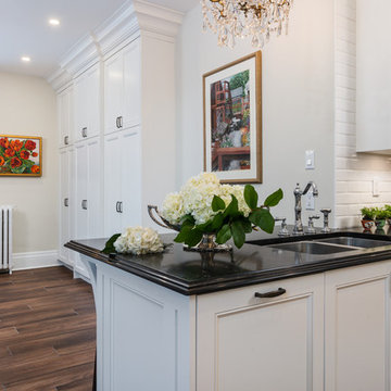 Inspiration for a large timeless l-shaped beige floor enclosed kitchen remodel in DC Metro with an undermount sink, recessed-panel cabinets, white cabinets, gray backsplash, an island and white countertops