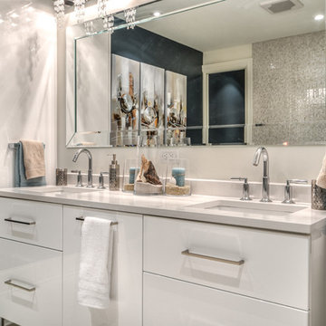 Example of a trendy master gray floor and mosaic tile floor bathroom design in Tampa with flat-panel cabinets, light wood cabinets, an undermount sink, brown walls and gray countertops