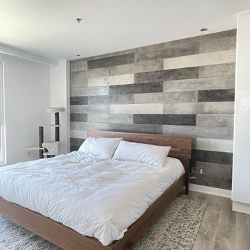 Renovation of a 1950's tract home into a stunning masterpiece. Matte lacquer finished cabinets with deep charcoal which coordinates with the dark waterfall stone on the living room end of the duplex.