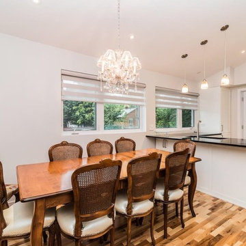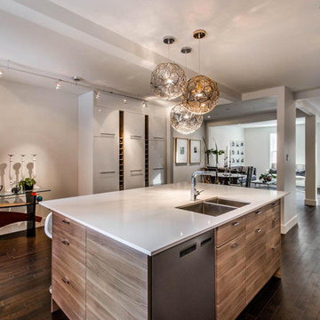 Renovation of a 1950's tract home into a stunning masterpiece. Matte lacquer finished cabinets with deep charcoal which coordinates with the dark waterfall stone on the living room end of the duplex.