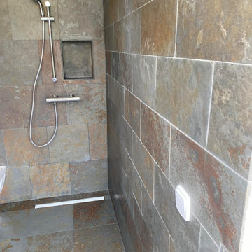 Example of a mid-sized trendy master blue tile and glass tile beige floor alcove shower design in Denver with blue walls and a hinged shower door