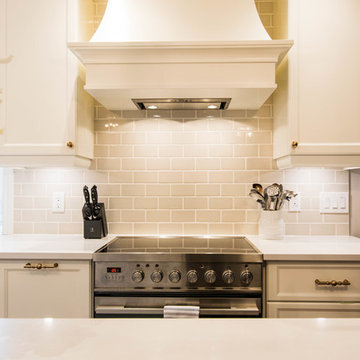 Transitional light wood floor kitchen photo in Miami with an undermount sink, shaker cabinets, white cabinets, beige backsplash and matchstick tile backsplash