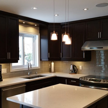 Eat-in kitchen - mid-sized transitional l-shaped medium tone wood floor and brown floor eat-in kitchen idea in Minneapolis with an undermount sink, shaker cabinets, quartz countertops, an island, dark wood cabinets, white backsplash, subway tile backsplash, stainless steel appliances and white countertops