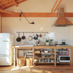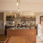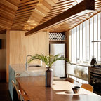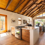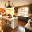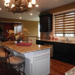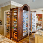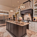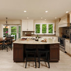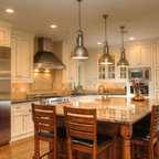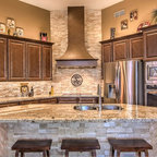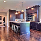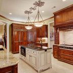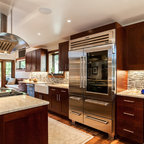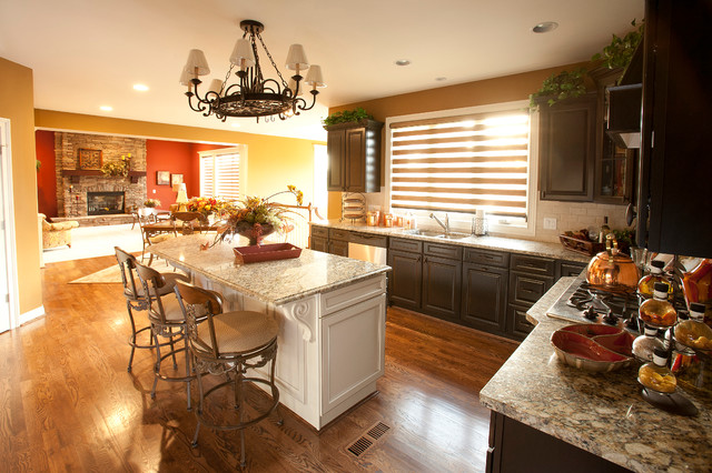 Eat-in kitchen - large transitional l-shaped medium tone wood floor eat-in kitchen idea in Cincinnati with raised-panel cabinets, dark wood cabinets, beige backsplash, stainless steel appliances, an island, a double-bowl sink, granite countertops and subway tile backsplash — Houzz